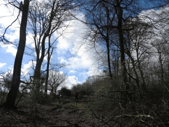 The cool morning helped as we attacked Red Hill heading north west into the woods. Onwards towards Bosmore Farm, resting briefly to take in the views. As per the forecast the sun broke through the clouds, which, along with the numerous daffodils, made us feel that spring had truly arrived. We descended through the woods towards Stonor where a number of us were nearly flattened by mountain bikers. All we heard was a loud crunching sound as they hit their brakes. Claire was ready to do battle with her walking pole! Good job they rode off at speed...