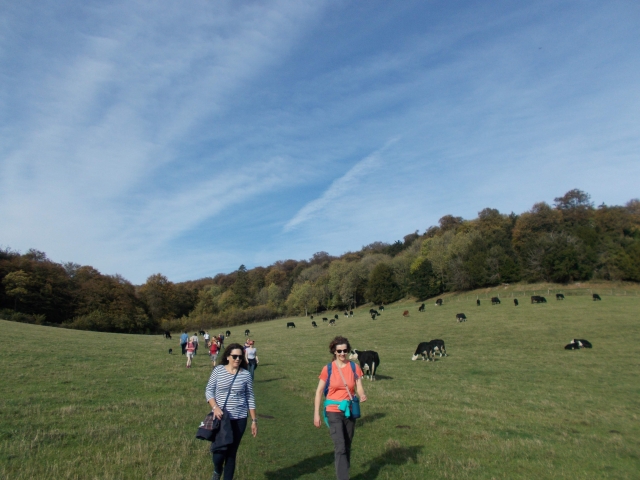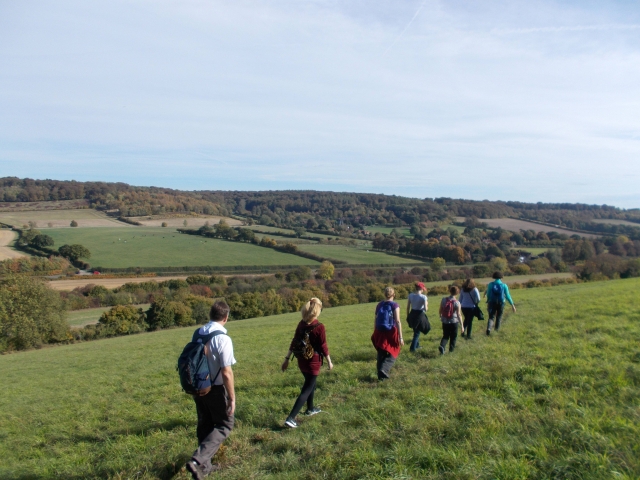 11 met on a very warm sunny day of this long Indian summer. From Saunderton we climbed to the Bledlow ridge and walked south with excellent views along the valley. In the sunshine the beech woods were dressed in flaming gold and yellow autumn colours. We met up with a Chiltern Walking Festival group whom we encountered at various spots as walking the same route. We stopped at Bradenham village, picture postcard perfect, with pub, village church, cottages and manor house all enclosing the cricket green. A red kite soared down to land on the wicket as we walked by. The paths were covered with dense layers of fallen leaves, with the sound of beech nuts crunching beneath our boots as we hiked through Naphill and Downley Commons.