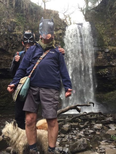 Friday began with a promise of fair weather so we set off for the first waterfalls walk. The stunning array of different types and size was amazing. A hidden waterfall was discovered by a breakaway group who later arrived at Sgwd Eira to discover that the waterfall was too torrential to walk under. The leading group headed back while the breakaways carried on down where young Laurence decided to take a first attempt at the falls. He reported back that there was a path behind it so we were able to stick to the plan and carry on the other side to Pontnedfecchan. After passing Dinas Rock we headed into town where the first pub didn't allow dogs. Luckily we found a better one that did. Later the others joined us along with Rob and Sandra that had travelled up that day. The rain then came as we settled in for late afternoon refreshments. Back at the bunkhouse with Rob and Sandra settled in the Shepherds Hut with welcome hamper provided by the owner. Another night of relaxing and tired heads.