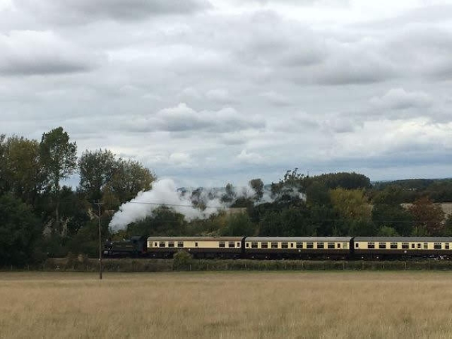 9 of us met at Princes Risborough for the steam railway walk. The connection between Chinnor steam railway and national rail network was just opened last month. After breakfast baps at the Café de la Gare we climbed aboard the heritage carriages for the scenic journey passing the Chiltern hamlets and cricket pitch on the way. At Chinnor we alighted from the steam train and walked to join the Ridgeway National Trail. On such a sunny day there were great views of the Oxfordshire Plain below. We reached the sleepy village of Bledlow and after touring the famous Lyde Gardens we had a leisurely lunch at the Lions pub watching the steam train pass back and forth in front of our tables.