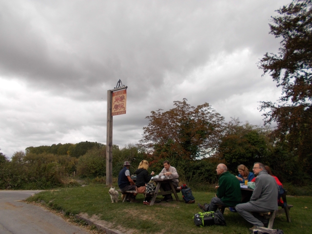 After passing through a park and a field with horses, we reached Blind Lane, an avenue of trees, then Herbert's Hole, a muddy path in a dry valley. Following uphill, we stopped to admire Pednor House. This is a beautiful red brick house, built in the 17th century as a farm house. A beautiful dovecote, with a cockerel on the top, fills the centre of the courtyard. After cutting across another valley and climbing a steep slope, everybody was happy to stop at The Bell at Chartridge. We enjoyed a delightful Sunday roast. Once upon a time, Chesham had one pub for every every 100 men, women and children! The Bell pub was first licensed in 1862.