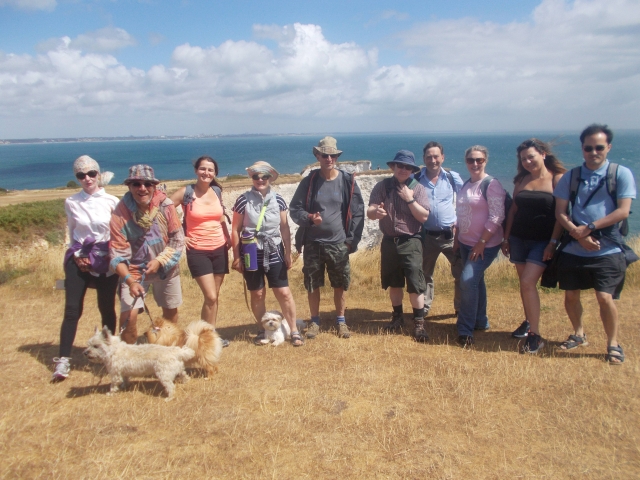 After the kitchen crew directed by Martina and Humay cooked up a storm for 23 people, Saturday brought sensational weather and an exciting bus journey. Jacquie managed to find us despite risking coming later and campervan Anne recruited a potential new member from the bus at Durdle Door, who stayed for lunch. We oohed and ahhed over the gorgeous sight of Lulworth Cove and Durdle Door and walked into the glorious sun to meet the campers at White Nothe. Tea stop and pub swiftly followed and Natalie surprised us all by arranging an impromptu party at the Smugglers Inn. We meandered home with smiles and managed to keep Jeff in sight all the way, no mean feat. Sisters Susie and Jennifer regaled us with tales of home before most of us went for a well earned pie. We met up with the intrepid geo-cachers, who left no stone unturned in their 8 mile scramble for treasure. Kim passed her novice badge and was awarded by Martina with a trackable. Music from the festival sent us to sleep.