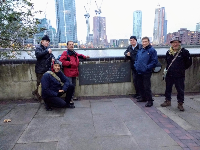 Not to be fazed we headed on to Brook Street where we were drawn to a grate in the centre. This was our first discovery of our brook right in central London. Chris provided a torch and we could all see the water rushing beneath. The stream has actually defined many boundaries. We find one in Bruton Lane with a stone plaque. The stream exits Mayfair via Shepherds Market, where the original May Fair was conducted on its banks. From here we enter Green Park and now the course is clear thanks to the King's Scholar Sewer which runs directly beneath Buckingham Palace. Through Pimlico, much of the Tyburn flows beneath the wide and winding Tachbrook Street. At the end the course dives beneath a housing estate and reappears just in time to join the Thames. The obligatory pictures were taken by the plaque, reminding us of our journey with a legend of place names, then across the road to the Grosvenor pub for gruel and grog.