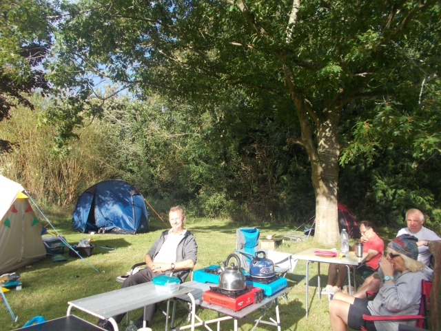 Our first camping trip of the year was another scorchio weekend in the Garden of England. Fallows Fields is situated within an orchard and our pitches were bordered by rows of apple trees. Glamping bell tents were everywhere on the site, we provided our own innovation with three inflatable tents. Nick was first to pitch and exclaimed "it's fully erect within seconds". Brian led the early arrivals on a walk around the perfectly preserved town of Sandwich. We followed the route of the town walls, passing many half-timbered houses and medieval churches. Maria pointed out a manor house featured in a recent reality television show. After fish and chips along the quayside we headed back to site to discover Martina pulling out of her pocket a conveniently pocket-size fire pit. Martina assembled the many poles and the netting to reveal a perfect fire pit inspired by Q. Over wine around the campfire various anecdotes were recounted: Dawn of her episode in a charity shop; Dan of his dance display at the Gents; and George of his time at a sauna in Cairo.