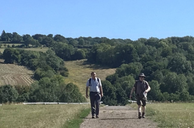 Six of us set off from Pangbourne, crossing the toll bridge with its chocolate box view of the Thames and Whitchurch village and picking up the Thames Path, conveniently wide for social distancing and shade. Some of us were sorely tempted to join some of the other swimmers in the river by the World War II pillbox. A steep climb upwards through Hartslock Nature Reserve, a site of special scientific interest with stunning views of the Thames at Goring gap was the high point of the day's walk. Congratulating myself on finding the correct entry point to the woods (missed on my recce) we stumbled upon a fallen tree which made a bench just perfect for a socially distanced lunch stop.