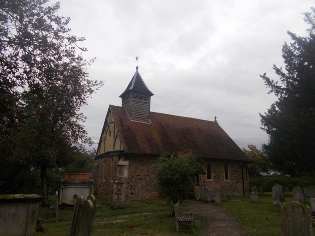 A small group of us set off from Chorleywood Station and met the remaining group at the car park near the cricket club. As a distraction from the rain Malcolm suggested a tour of the wood sculpture park in the grounds of Chorleywood House. We headed down to the River Chess path and then walked up past Goldingtons to Church End. The house dates back to the 16th century, enjoys fabulous views across the Chess Valley and was one of the settings used for filming Four Weddings and a Funeral. We reached Sarratt and had a short break in the bus shelter.