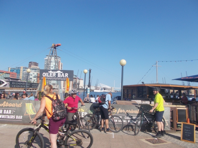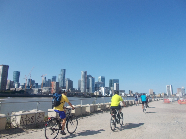Our original intention was to return to the north bank of the river at the Woolwich Ferry a couple of miles east of the barrier but due to maintenance work being done on the day a hasty alternative was sought and we chose to ride the cablecars at the O2 which proved to be a much better option as there was a floating bar next to the disembarkation point. A refreshing drink or two and some spectating of the wakeboarders in the Royal Victoria Dock took place before we headed north towards the Greenway which took us west for the first time and quickly back to the start point in Stratford.