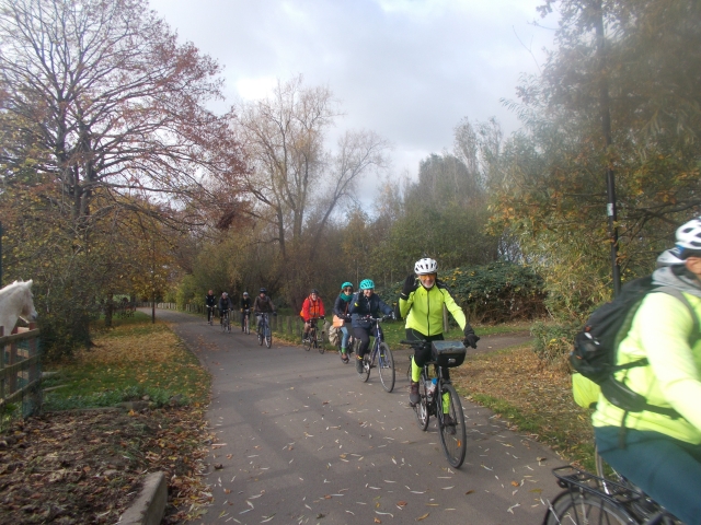 Nine cyclists met on a sunny bracing morning at Northala café. After bacon butties we set off along the Grand Union Canal eastwards. The canalside trees were still full of autumn colour and a heron was spotted within the barges. We crossed the aqueduct at Park Royal noting some anglers along the route. At Old Oak we cycled under the new conveyor belt bridge taking the spoil from the HS2 tunnels. From the bridge we took in the vast Old Oak Common site, the new HS2 and Crossrail stations still at foundation stage. We left the canal to do a tour of Wormwood Scrubs, the parkland covered with football pitches. Our coffee break was at the stadium where we met by chance the Ealing Cycle Group travelling east.