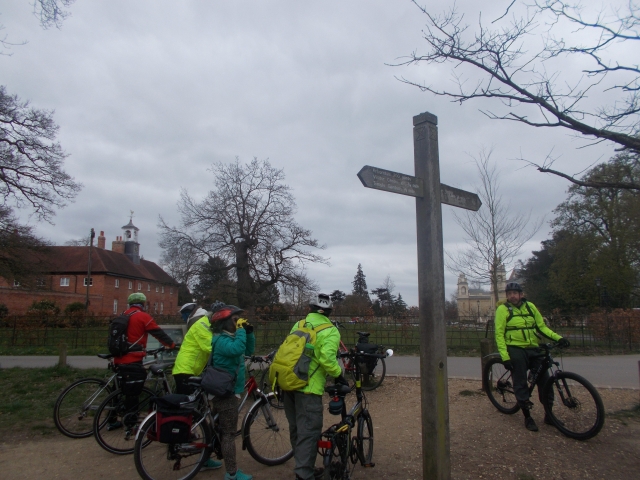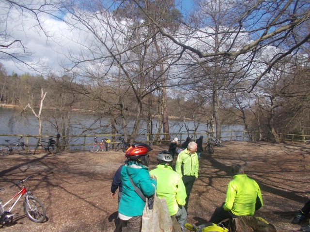 Easter Monday saw nine cyclists assemble for the first cycle ride of the year. We departed the Rusty Bike cafandeacute; and joined the Grand Union Canal south. Our route then took in Systran's route 61 through farmlands and country estates of Iver and Richings Park. Derek tested his new electric cycle on the hills, sometimes even waiting for Prem. We made it to the elegant, landscaped grounds of Langley Park where we encountered Victoria Meldrew on a path. Our lunch stop was at the lakeside cafandeacute; in Black Park. New recruits Muneer and Simon debated the merits of carbon fibre frames with Kerry and Coogee.