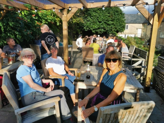 The rain stopped and we pressed on through a golf course and onto a path along the River Colne that would lead us back to our start point... Well, at least that was the plan, but unfortunately due to the HS2 works the chosen path was closed. We quickly chose a detour and headed for the canal towpath to get us home. Fortunately, we also got to see the Piano Boat, a narrowboat that does trips along the canal accompanied by music from an onboard grand piano. Back at the Old Orchard we were treated to a delightful roast dinner on the terrace as the weather held and we delighted in the great views and even greater company. Many thanks to all that attended.