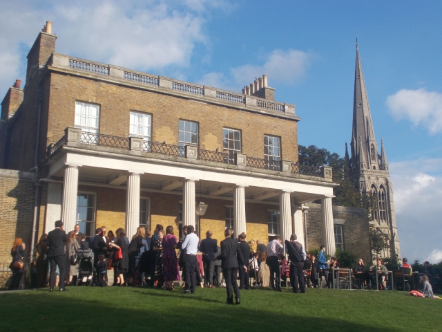 Our route continued to Highbury Stadium, home of the Arsenal till 2006. Two of the original stands are preserved and now house fully glazed apartments. The classic 1930s Art Deco facade of the East Stand, with the Field Gun Emblem and lettering, is all restored and resplendent in the sun. We smuggled ourselves into the complex and found the football pitch now serving as the gardens for the residents. Our kickabout on the pitch lacked a real football so we crossed the tracks to visit the new home of the Arsenal, the Emirates. Our circuit of the vast stadium revealed huge murals of former heroes prominent on the new elevations. We followed the LCC quiet ways route to reach Clissold Park, another fashionable area with boating lake, mini zoo and 18th century mansion. At Clissold House we stopped to witness a society wedding taking place, the happy couple exiting the Georgian villa under a shower of confetti. Routemasters, decorated for the occasion, were outside so we jumped on the open platform before the guests arrived. "Time for tea?" asked Tim. "Jolly good idea" said all. So, across the road we spied a pop-up café with lots of tables in the gardens of the Victorian church. We ended the ride with tea and cakes, listening to a Russian accordion player serenading yet another wedding party in this charming quarter of London.