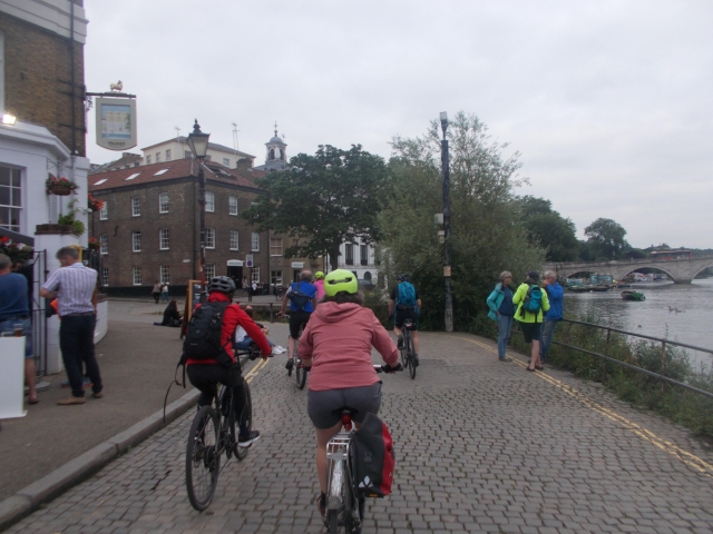 Just three cyclists for this longer ride from Windsor Riverside to Richmond. We followed Sustrans route 4 throughout, very good signage all the way. After checking out the castle we cycled through Windsor Great Park until Englefield Green. We then climbed to the Coppers Hill memorial viewpoint. As the day had warmed up in the sunshine we had our picnic there. It was very quiet in the park with the memorial always tranquil and poignant. We then joined the Thames at Staines and followed the well-managed Thames Path all the rest of the route. Many impressive boat houses on the opposite bank, plus lots of heritage vessels on display. We rang the bell to summon the ferry from Shepperton to Chertsey. Final tiffin stop at Walton on Thames, busy with walkers, before final section from Hampton Court to Richmond.