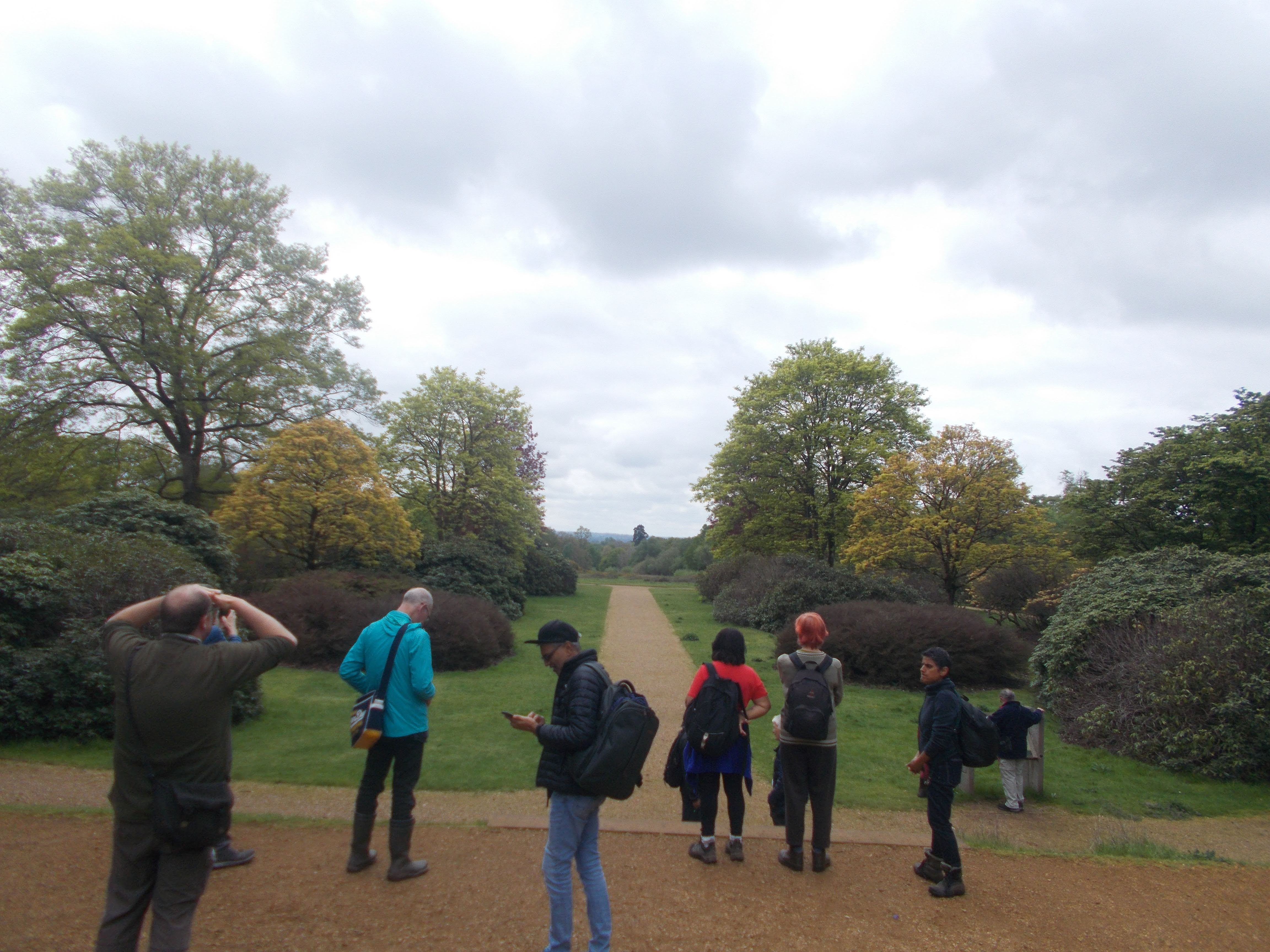 Bentley Priory has a number of ancient woods. Growing there are hornbeam, midland and common hawthorn, birch, cedars, yew, and odd patches of laurel, and rhododendron. We waded through muddy ground in search of the master oak tree, the oldest tree in Middlesex. At one point, I thought it had moved! At last we located it and were all so appreciative to see close up this amazing master oak tree. Many photos were taken there. The tree is near a beautiful large pond. We headed through muddy woodland until we got to the lane leading down to the deer park and had our group picture taken.
