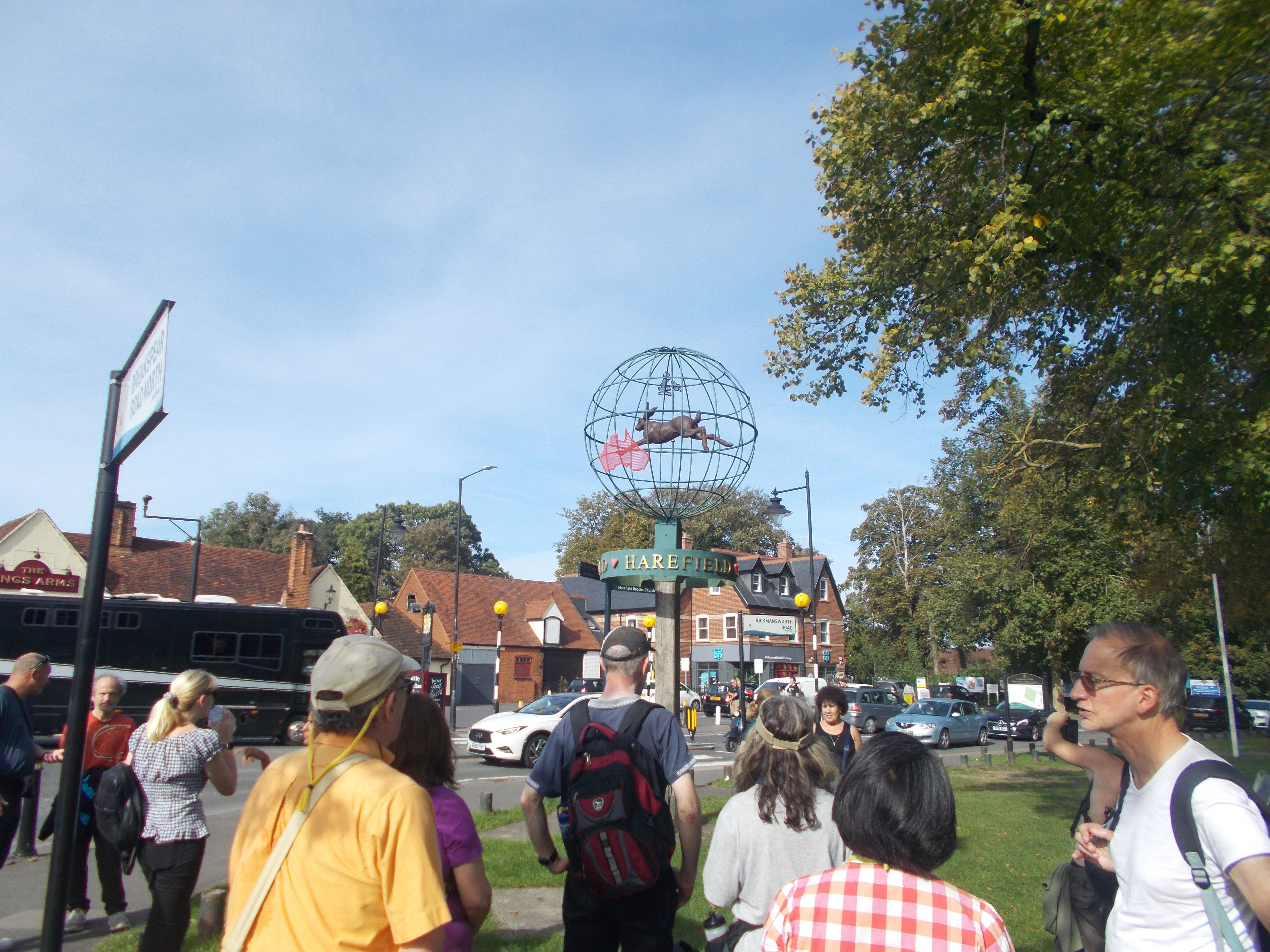 Twenty-two met on a very sunny warm morning at Black Jacks Mill tea rooms. Over coffee and bacon baps we watched the barges negotiate the lock. Our route was south along the Grand Union Canal to Harefield bridge. From there we walked to the 14th century village church. We visited the Commonwealth War Graves, immaculately maintained. Then into the church where a service had just finished. The verger explained that the flowers were from the harvest festival. The Jacobean memorials inside are very ornate, featuring many of the Newdigate family who were the leading landowners. We then walked past the almshouses to the village, stopping at the Georgian manor of Harefield House. Jeff confided that this was his workplace back in the day where he was a student scientific officer for the Air Ministry, all hush hush of course. Onto the grounds of Harefield Place, another Georgian mansion, now a famous hospital. We took in the restored stables block and views of the 1930's sanatorium buildings (south facing in a crescent to maximise sunshine into wards). Then Sadie (former nurse there) led us around the "healing garden" including a sculpture of Hartley Hare. We then descended via tracks back to the canal and completed the circuit back to Jacks Lock.