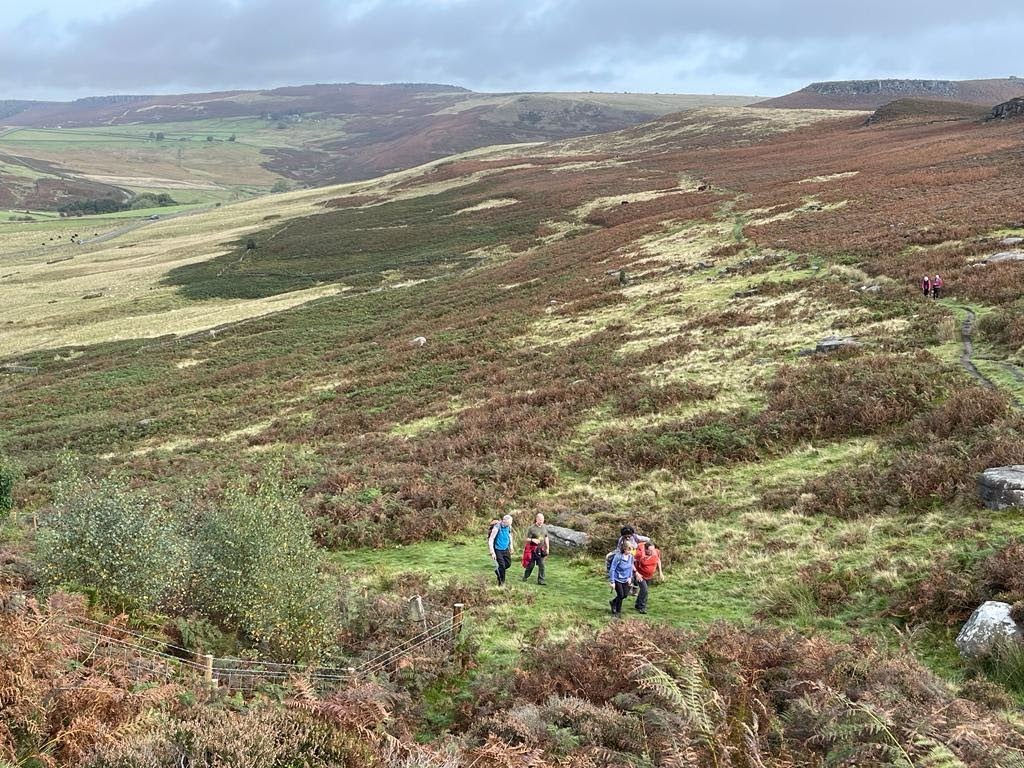Our early autumn break took place in the Peak District National Park at the Derbyshire town of Hathersage. The EMR conductor (purple uniform matching the train livery) directed us to the Sheffield Tap to spend the time waiting for the connection. The Tap is a recreated Victorian station in the Grecian splendours of Sheffield Station, and we supped on some local brews admiring the fountains and steel artwork celebrating Sheffield industry. Twenty-two of us gathered in glorious sunshine at the hostel and set off on the afternoon Derwent Valley Walk. Sandra welcomed her friends Kevin and Isobel (locals and very enthusiastic hikers and climbers) as first surprise guests. We skipped over the stepping stones including one leap of faith over a gap. The route took in the meadows, criss-crossed by dry stone walls, sheep gambolling in the sunshine. Sally led us to the free drinks and nibbles at the village pub (Aperol Spritz promotion), before our sumptuous curry meal perfectly hosted by Diane as always.