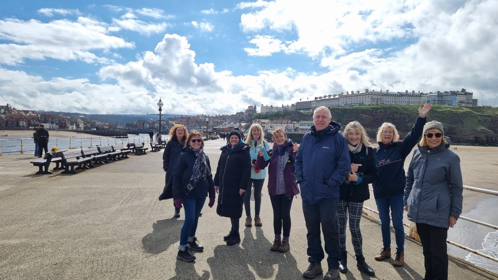 For our Easter holiday 26 took the fast train north to Scarborough and Whitby on the North Yorkshire Moors National Park. Judith had a close encounter in her carriage with a very special adviser of a former prime minister. Diane had booked us into the wonderful Grand Hotel at Scarborough, built in 1867 as the largest hotel in Europe to welcome the crowds after the arrival of the railway. The opulent entrance hall, ballroom and grand staircase were all redolent of the hotel's golden age. We toured the esplanade of Scarborough, happening on a tea dance at the Spa Pavilion, passing the sun terrace and bandstand above the long sandy beach. Joan went both ways on the oldest funicular in England. Our walk climbed up the cliffs to Scarborough Castle dominating the headland. After the group meal we assembled in the ballroom for the cabaret, an ABBA tribute act with lots of glitzy costumes.